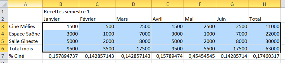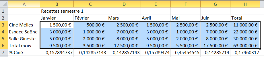 Vous souhaitez obtenir ce petit tableau récapitulant et cumulant les recettes des salles de spectacle de votre commune sur les six premiers mois de l’année ?